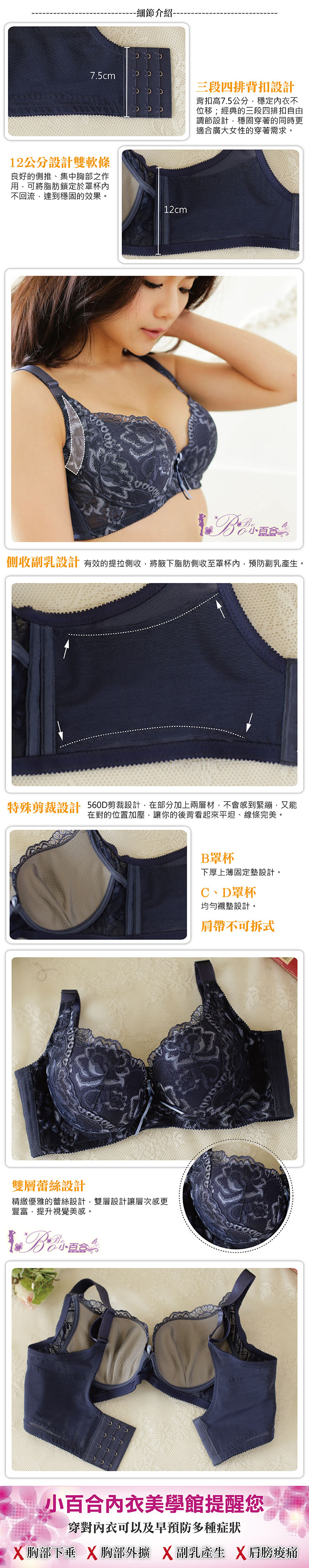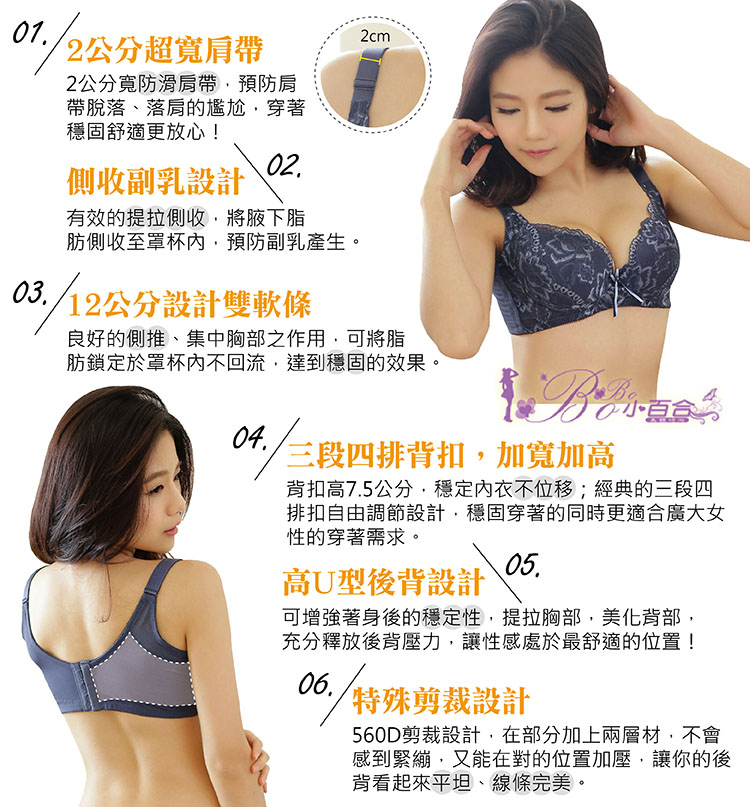 1.2公分超寬肩帶:2公分寬防滑肩帶,預防肩帶脫落、落肩的尷尬,穿著穩固舒適更放心。 B罩杯為下厚上薄固定墊設計 | |||||